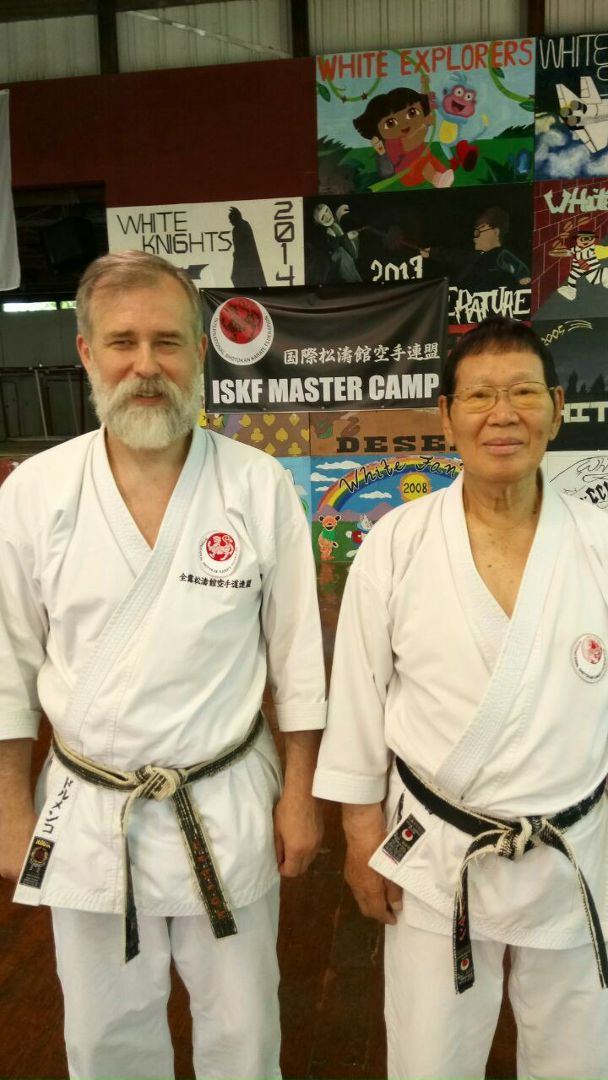Master Yutaka Yaguchi 9 Dan and Andrey Dormenko 8 Dan, «Страна индейцев 2017». 9 июня начинался Master Camp ISKF. Как всегда, подготовительная работа, предшествующая путешествию в Филадельфию начиналась ещё в феврале. Подготовка и обработка документов, анкет, визовая поддержка, покупка билетов – всё это требовала массы усилий и не терпит штурмовщины. Но всё осталось позади и мы вполне успешно преодолели Атлантику за 8 часов и приземлились в аэропорту Нью Йорка. Пограничный офицер доброжелательно на меня взглянул, полистал паспорт и, не задав мне ни одного вопроса, поставил штамп о прибытии в США и я вновь оказался на американской земле. Бросок на такси до Пеннстейшен на Манхеттене был ничем не примечательным и рутинным. Огромные пробки, которые и не снились Москве – это единственное заметное впечатление от этой поездки. Один час в скоростном поезде, и - мы уже садились снова в такси уже на вокзале в Пенсильвании, в Филадельфии. Снова забитый машинами город, суженные за счёт ремонта дорог трассы, Узнаваемый поворот на Грин Лейн и мы подъехали к знакомым строениям нашего Лагеря. Ощущение что мы никуда не уезжали. Домашняя, привычная и приятная обстановка, приветливые люди, старые друзья с которыми мы вот уже почти десять лет снова и снова встречаемся здесь. Полчаса на хлопоты по регистрации, оформлению и размещению. Можно первый раз перевести дух. Утро. 6.00. Все уже на ногах. Официальный подъём в лагере и все выходят на площадку теннисных кортов для общего построения и разминки. «Приветствие солнцу». Именно так и получается, потому что стоя лицом на восток можно видеть, как из-за макушек рощи поднимаются первые лучи солнца. Пока все стоят по команде «мокусо», яркий луч света озаряет всё вокруг и всё оживает и радуется новому дню. Одед Фридман неизменно проводит утреннюю разминку и каждый раз в разном ключе – очень много игровых моментов, весёлых и оригинальных активных перебежек, и упражнений. Дальше – все отправляются на двухкилометровую пробежку и затем все расходятся по трём рабочим Dojo: Shoto Dome, Okazaki Dome, Nakayama Dome. Полтора часа тренинга. Затем приведение себя в порядок и завтрак – обильный, сытный, разнообразный хоть и типично американский. Далее по регламенту начинаются различные специальные мероприятия: в субботу детско-юношеский турнир, в воскресенье – письменный экзамен на ранги инструктора, судьи и экзаменатора, а также аттестация на 1-5 Даны, понедельник – встреча представителей ISKF (Country Directors) и руководителей ISKF, среда – практические занятия по судейству. Вторая половина дня не менее насыщенная. Две тренировки подряд: с 3.00 до 4.30 и с 4.30 до 6.00. Первая – для инструкторов и членов программы стажёров, вторая - общая. Сенсеи сменяют друг друга, тренировки имеют разную интенсивность и объем информации. Неизменно одно – интерес, неподдельный и искренний всех участников процесса. Такахаши сенсей очень специфичен своим незамысловатым кихоном, однако всё добротно и основательно. Очи сенсей, несмотря на возраст и болезни, преследующие его попятам, старается подбодрить всех своим позитивом и радостью жизни – трудно найти на Мастер Кемпе более жизнерадостного человека среди взрослых, разумеется, потому что дети всегда жизнерадостны и включены в жизнь, в радость, в движение. Сколько бы ни было тренировок дети всё равно находят в себе силы для бесконечных игр, забав, веселья 
